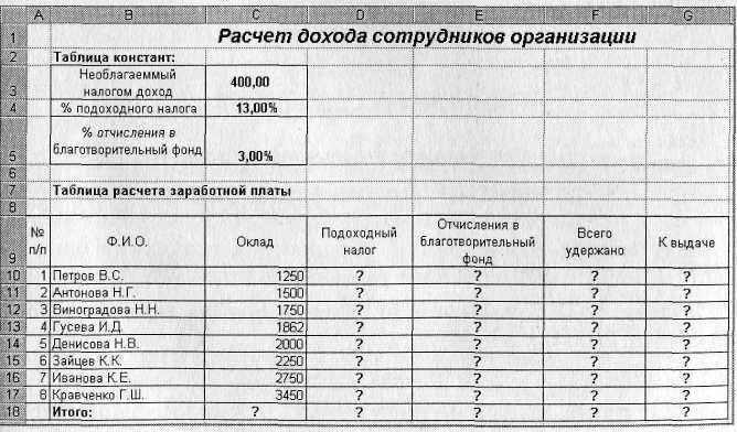 Всего удержано = Подоходный налог - Отчисления в благотворительный фонд, в ячейку F10 введите формулу = D10 + E10; К выдаче = Оклад - Всего удержано, в ячейку G10 введите формулу = C10-F10.