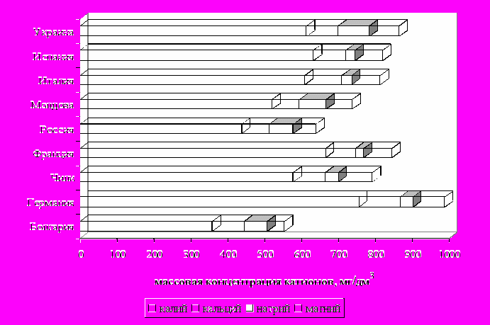 Вина Германии отличаются высоким содержанием катионов, в частности ионов калия, кальция, магния. Низкие значения массовых концентраций катионов характерны для вин Болгарии. Ионы калия составляют в среднем 73 % от общей суммы катионов, максимальная доля ионов калия в сумме катионов установлена в винах Франции (80%), минимальный – в винах Болгарии (65 %). В минеральном составе вин доля кальция составляет от 10-12 %. Доля натрия незначительна (3-4%) в винах Германии, Чили, Франции, Италии, Испании, для вин других стран она составляет 10 %. Вклад ионов магния в минеральный состав 8-10%.