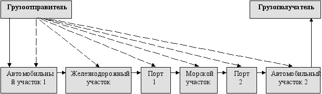 Штриховые стрелки – договорные отношения грузоотправителя (грузополучателя) с экспедиторами смешанной перевозки грузов;