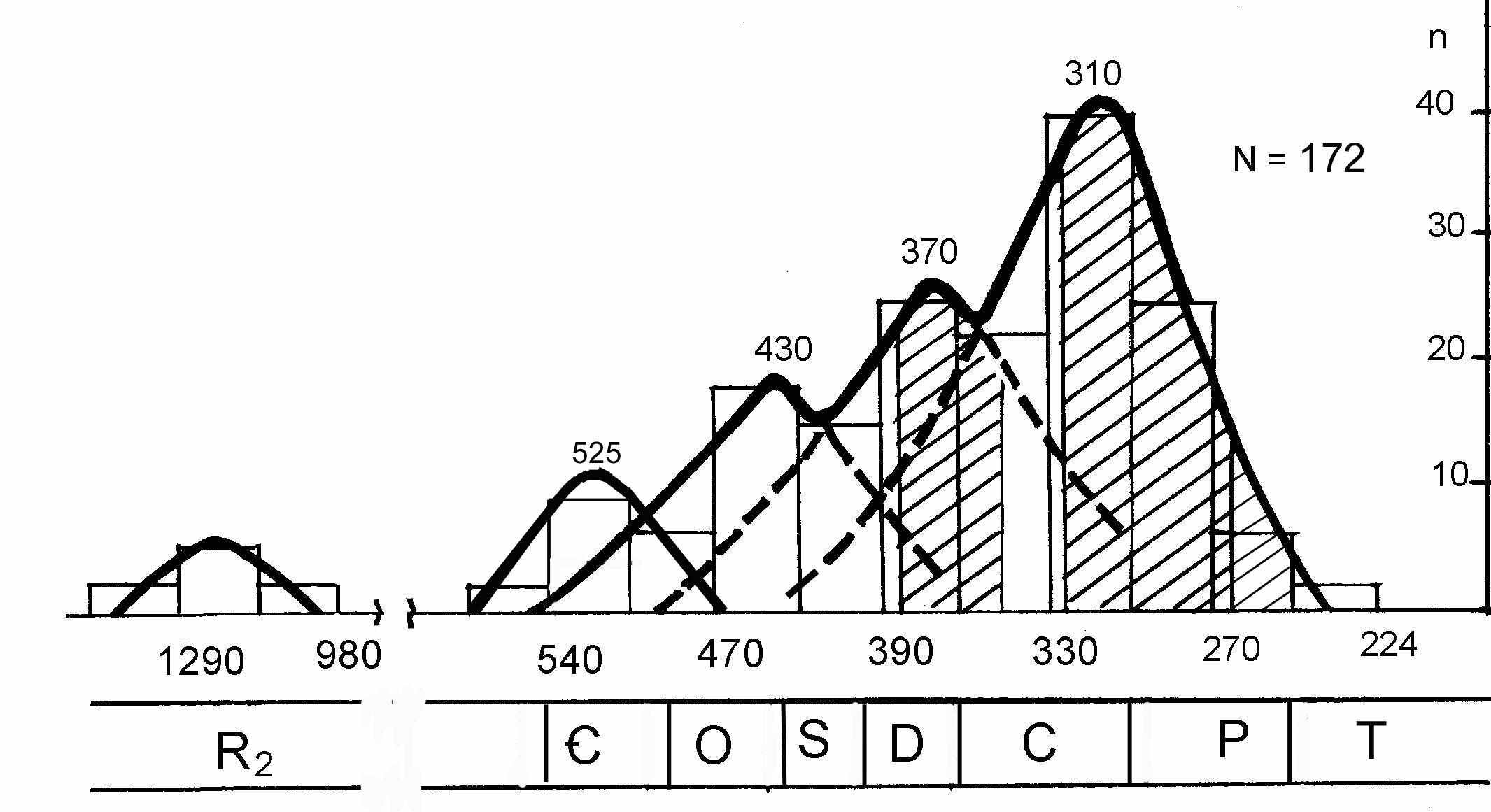 Рис.1. Гистограмма распределения значений абсолютного возраста пород