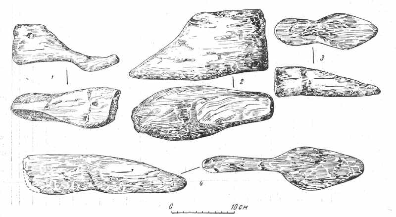 Составные колодки, несомненно, служили моделью при пошивке обуви, как и в современном сапожном производстве. Их можно также называть затяжными колодками. Что касается простых колодок, то большинство их использовалось после того, как подошва была пришита к верху обуви. Поскольку верх и низ обуви скреплялись выворотным швом, такую обувь необходимо было расправлять и околачивать на колодке. Для этого и предназначались простые колодки — правила. Среди них были правила для обуви подростков и взрослых. Первые отличались более простой формой и меньшими размерами. Длина таких колодок — от 14 до 16, 5 см (рис. 1, 3), ширина — от 4 до 6 см, высота — от 2, 5 до 4, 5 см. Кверху колодка немного сужалась и представляла собой небольшой брусочек с округленными носочной и пяточной частями, со слегка выраженным переходом между ними. Были колодки для левой и правой ноги.