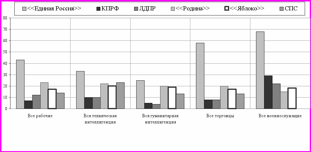 Анализ этих данных позволяет сделать вывод о том, что петербургские избиратели, составляющие основную часть среднего класса, во время голосования выбирают в первую очередь между «Единой Россией», «Яблоком» и «Родиной» и во вторую очередь – между КПРФ, ЛДПР и СПС. «Средние русские» в силу комбинированного характера их ценностных ориентаций склонны выбирать между партиями в зависимости от того, насколько позиции этих партий соответствуют их социальным ожиданиям.