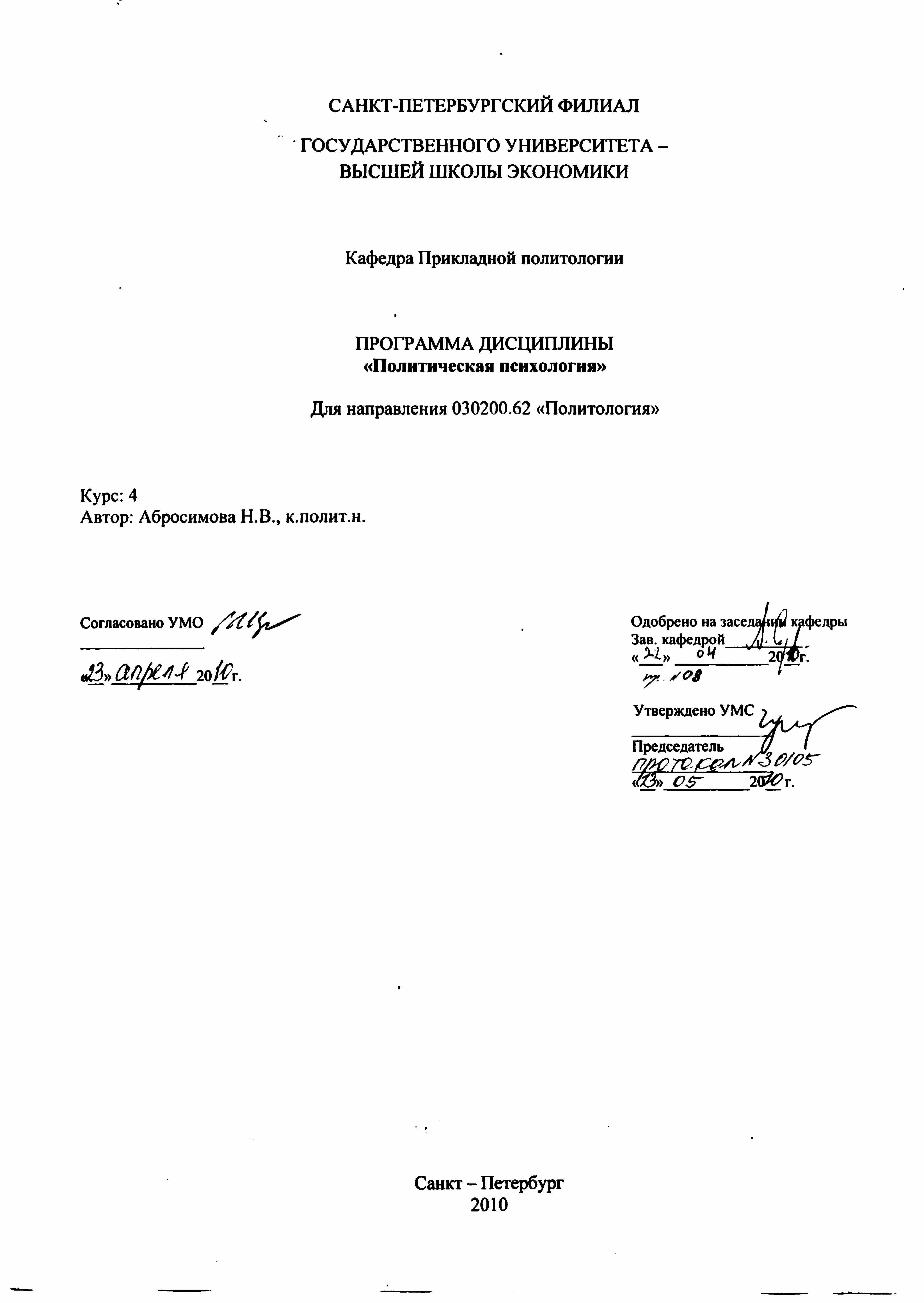 Учебная программа по курсу «Политическая психология» предназначена для подготовки студентов по направлению 030200.62 «Политология» отделения прикладной политологии факультета менеджмента Санкт-Петербургского филиала Государственного Университета – Высшая Школа Экономики.