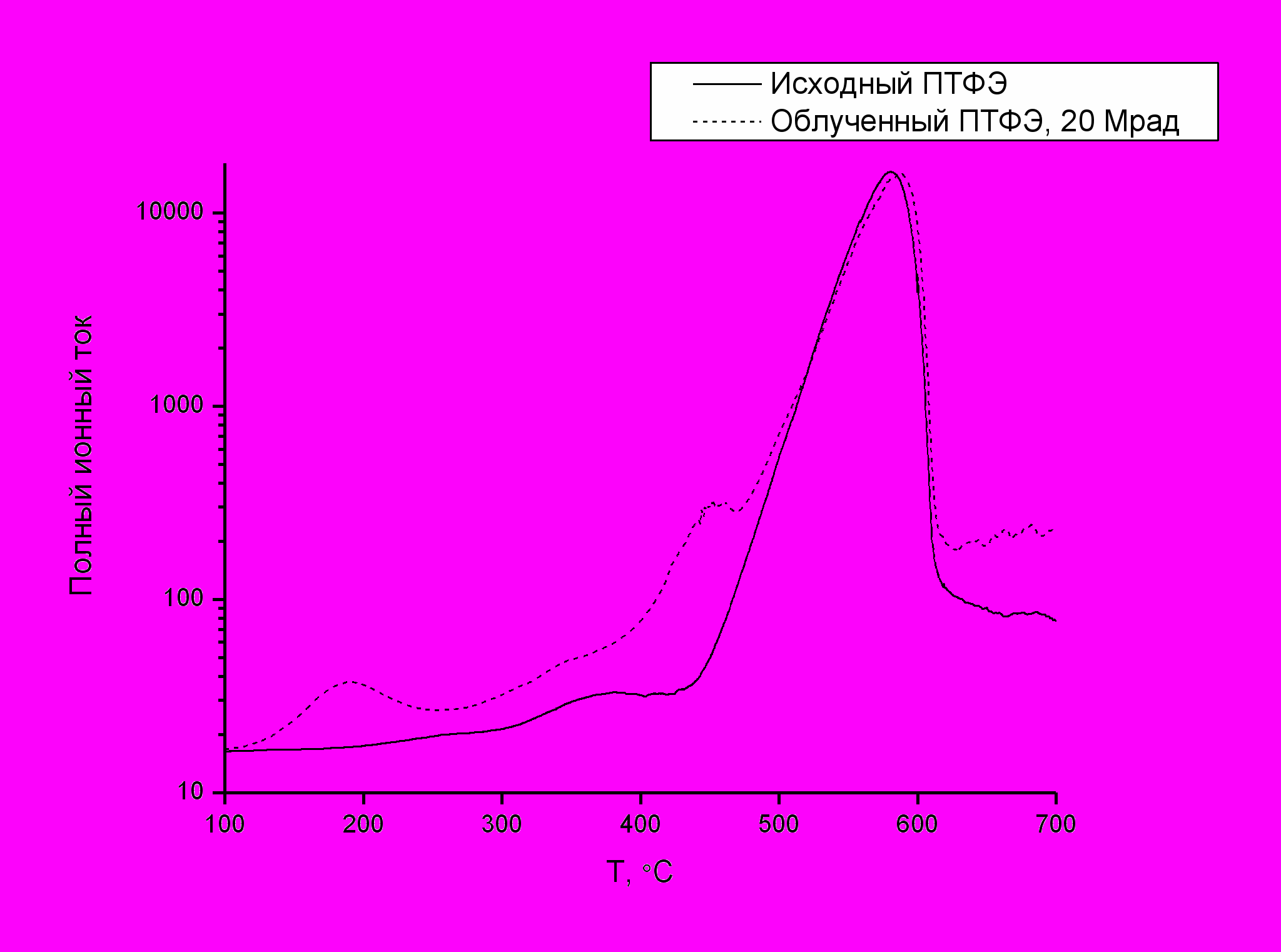 На рисунке представлены температурные зависимости полного ионного тока для исходного и облученного фторопласта-4 (доза 20 Мрад). Разложение исходного ПТФЭ, является одностадийным процессом с максимумом вблизи 580°С, разложение радиационно-модифицированного ПТФЭ, это двухстадийный процесс с максимумами при 450 и 580ºС.
