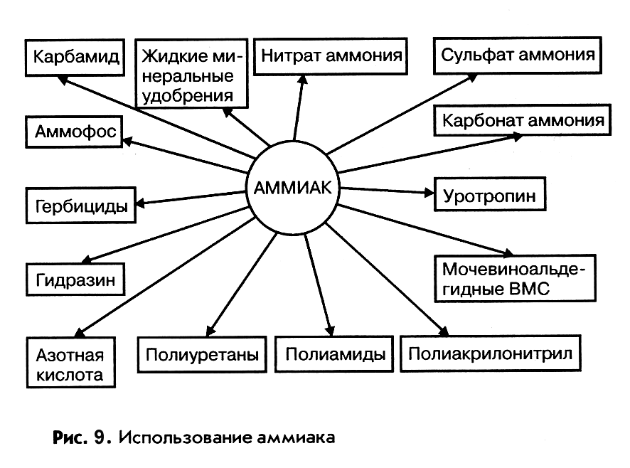 Аммиак – ключевой продукт для получения многочисленных азотсодержащих веществ, применяемых в промышленности, сельском хозяйстве и быту. На основе аммиака в настоящее время производятся практически все соединения азота, используемые в качестве целевых продуктов и полупродуктов неорганической и органической технологии. На рис. 9 представлены основные направления использования аммиака в промышленности и сельском хозяйстве.