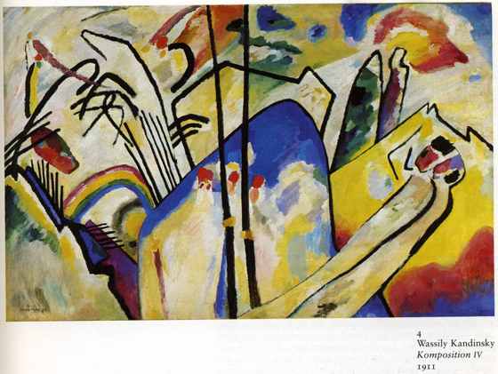 - В. Кандинский. Композиция IV, 1911. Перевод реальности в систему линий различного очертания и пятен цвета.