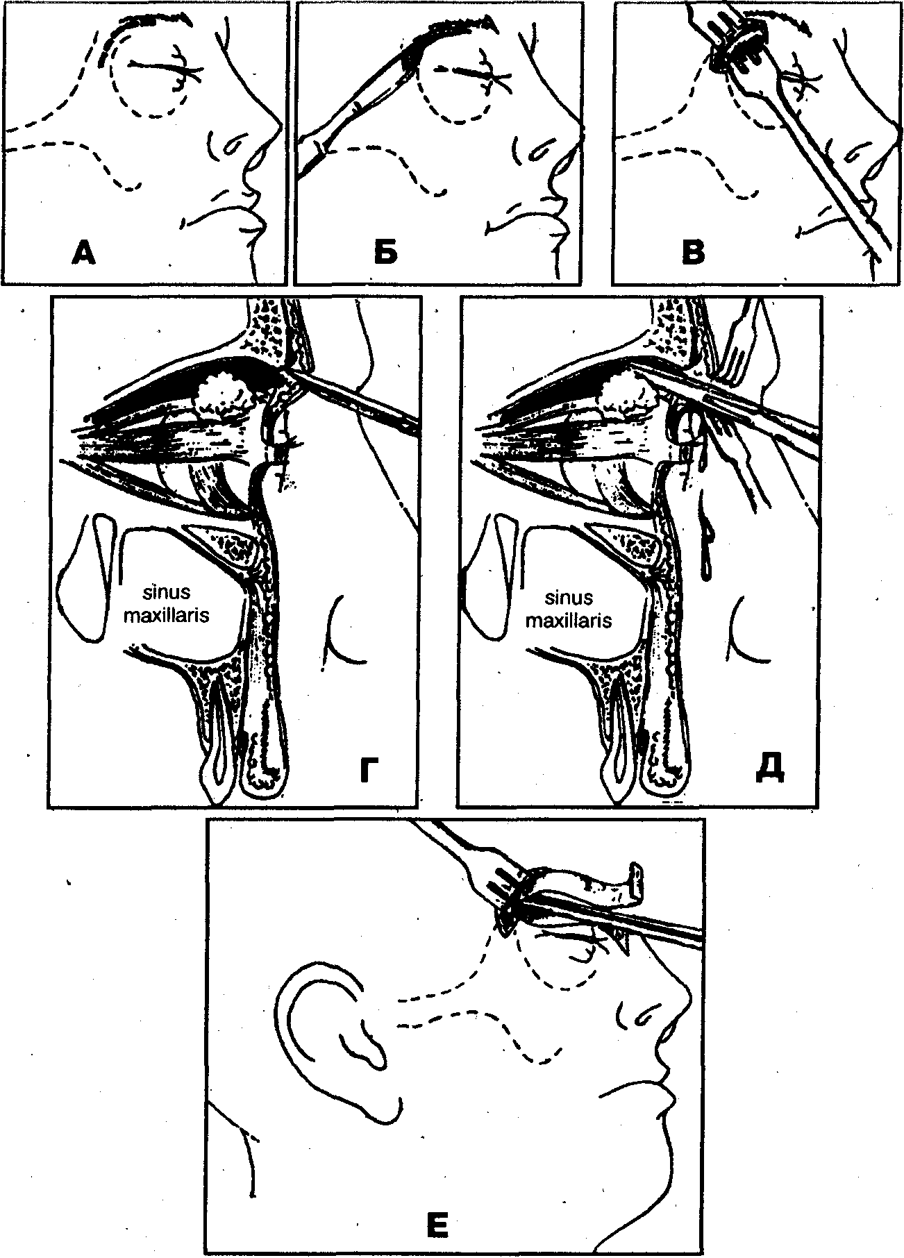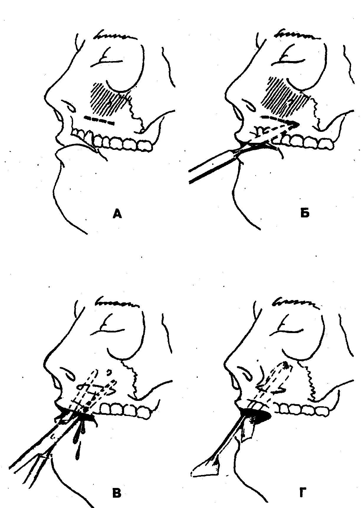 2. Разрез слизистой оболочки и надкостницы (десны) альвеолярного отростка верхней челюсти вдоль свода преддверия рта на протяжении всего воспалительного инфильтрата (рис. 1, А, Б).