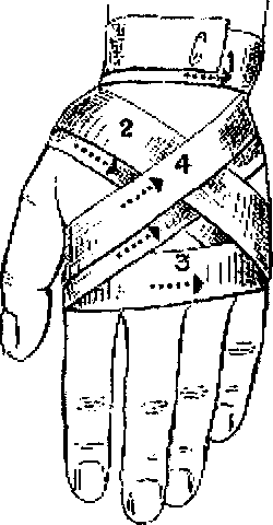 тылу кисти возвращаются на запястье. В дальнейшем ходы повторяют. Заканчивают повязку круговым ходом на запястье.