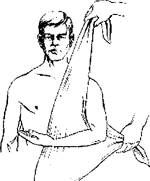Для подвешивания верхней конечности середину косынки подводят под предплечье согнутой в локтевом суставе под прямым углом руки (рис. 18). Кисть должна находиться у самого длинного края косынки. Один конец косынки (тот, что ближе к телу) проводят через здоровое плечо, а другой — через больное. На шее сзади оба конца связывают. Третий конец обводят вокруг локтя и булавкой фиксируют в передней части косынки с некоторым натяжением.