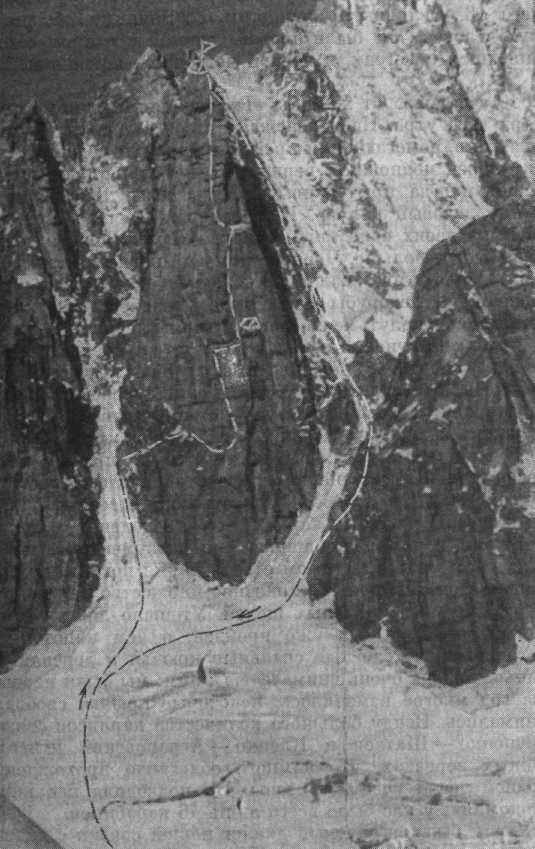 Трудности передвижения, связанные с организацией самостраховки и вытаскиванием рюкзака, который с каждым подъемом становится все тяжелее, замедляют и осложняют работу. Сразу же после полудня я взбираюсь на уже знакомую мне полку «деревянных клиньев». Она полностью покрыта снегом. Потом прохожу сложную систему каминов. Но на этот раз не обхожу слева известную широкую расщелину, а поднимаюсь прямо по ней вверх, как бы единым порывом, и вскоре нахожусь на террасе, откуда мы с Мори отступили в 1953 г. С обеих сторон, уходящей вверх от меня «Ящерицы» пет ни одного места, пригодного для бивака. Очистив площадку от снега, я устраиваюсь на второй бивак, хотя еще не настал вечер. Но с меня достаточно. Потихоньку сосу небольшую льдинку, чтобы хоть как-то утолить жажду.