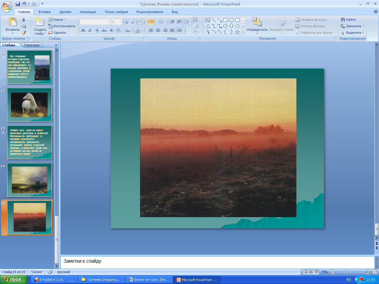 ( На уроке используется компьютер. Подготовлена презентация «И. С. Тургенев «Бежин луг» из 15 слайдов, которые демонстрируются в ходе урока. 1 слайд – название темы урока; 2 слайд – портрет Тургенева; 3, 4, 5 слайды – «Бежин луг, Тургенев-охотник»; 6, 7 слайды – надписи-выводы; 8 слайд – картина ночного луга; 9, 10, 11, 12 слайды – «Крестьянские мальчики»; 13 слайд – надписи-выводы урока; 14, 15 слайды - картины природы.)