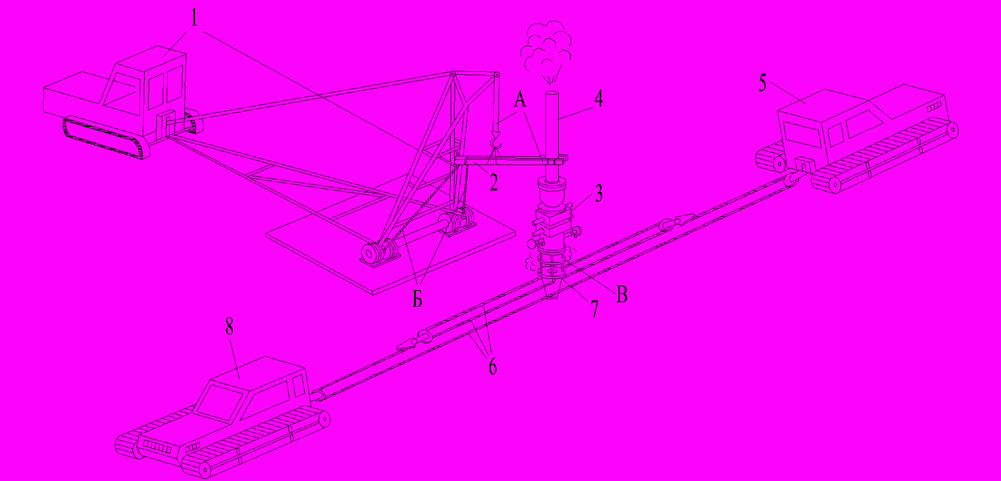 5 – трактор–тягач; 6 – канатные петли; 7 – устье скважины;