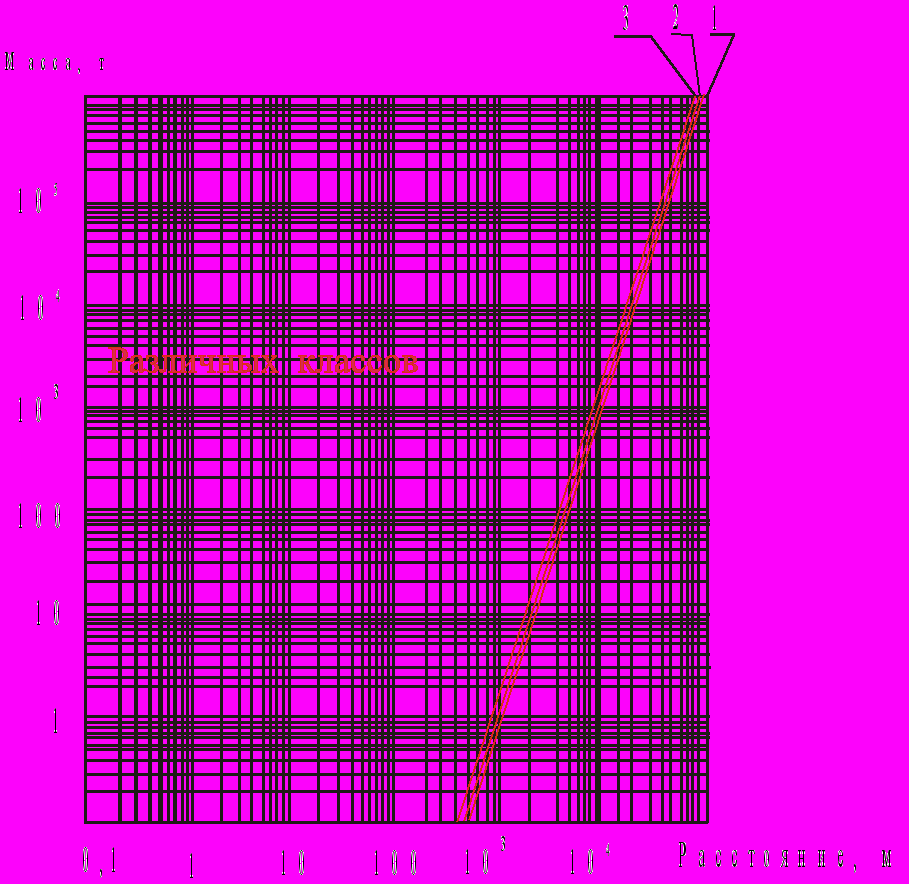 Рис. 7.4. размеры зоны расстекления при взрывах КВВ различных классов.