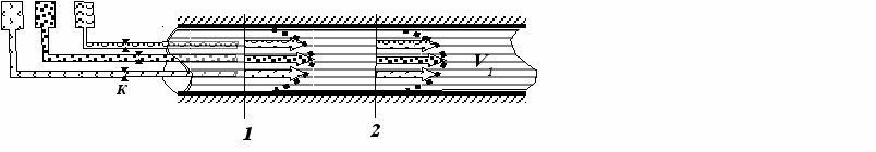 озьмём прозрачную трубу, в которой с небольшой скоростью V1 течёт прозрачная жидкость, например, вода. В этот поток поместим небольшие, существенно меньшие, чем диаметр потока, трубки. В трубках под напором находится подкрашенная жидкость, например, цветные чернила, которая может из них вытекать, если открыть краны К. Будем открывать их на короткое время (1-3 секунды) и прекращать подачу чернил через какие-то промежутки времени так, чтобы можно было проследить движение цветной жидкости. В таком случае в потоке будут возникать разноцветные струйки, причём цветная жидкость будет явно показывать распределение скоростей (эпюра скоростей) по сечению потока. Это распределение будет соответствовать рассмотренной ранее струйной модели потока. Если наблюдать за движением жидкости, то можно ясно видеть, что при перемещении от сечения 1 к сечению 2 картина распределения скоростей будет оставаться постоянной, а движение жидкости будет слоистым, плавным, все струйки тока будут параллельны между собой. Такое движение носит название ламинарное (от латинского слова lamina - слой).