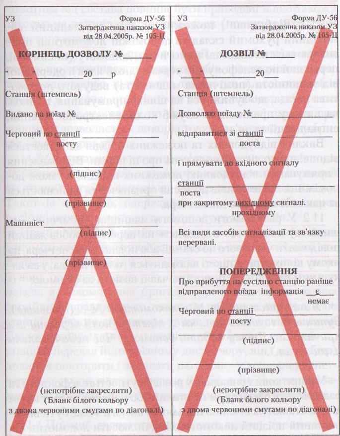 10.2 Правом на занятие поездом перегона при перерыве действия всех средств сигнализации и связи служит разрешение на бланке белого цвета с двумя красными полосами по диагоналям, которое выдается дежурным по станции машинисту (бланк формы ДУ-56).