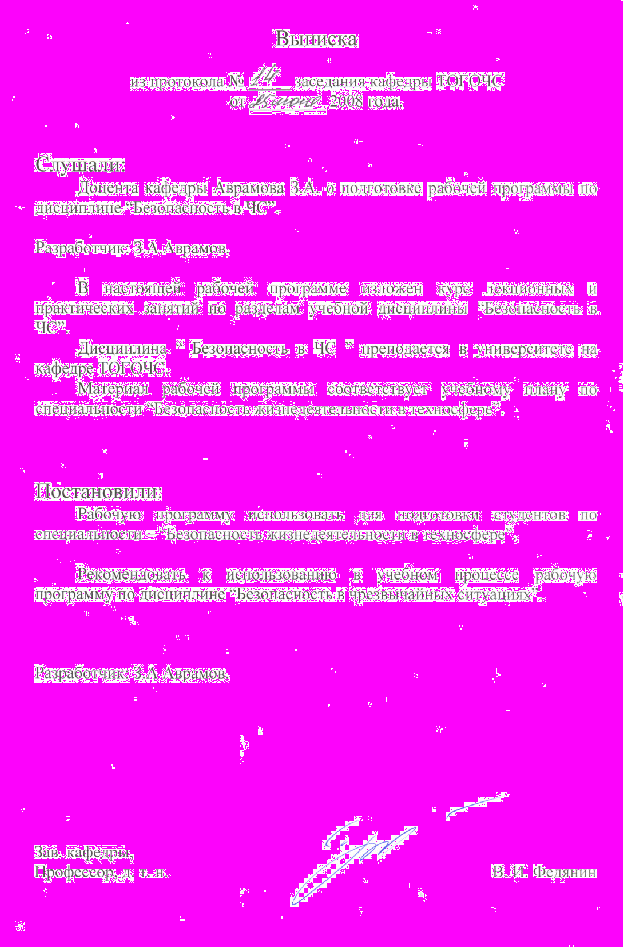 Рабочая программа составлена в соответствии с Государственным образовательным стандартом на основании примерной программы дисциплины “Безопасность жизнедеятельности” утвержденной “19” декабря 2000г. Министерством образования России и согласованной с МЧС России “14” декабря 2000 года.
