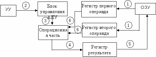 Из УУ в блок управления АЛУ поступает команда на выполнение той или иной операции (связь 2), которая передается им в операционную часть (связь 3).
