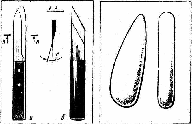 Чтобы нож не потерял твердость, его лезвие прижимают к абразивному кругу с небольшим усилием, без остановки плавно перемещают его и периодически охлаждают в воде. Правильно заточенный нож должен иметь светлую ровную и плоскую фаску с углом заострения 3—5°.