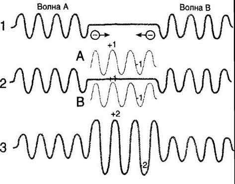 Деструктивная интерференция. На рис. 1 волна, поднятая первым камнем (волна А), движется слева направо. Волна В, движущаяся справа налево, поднята вторым камнем, брошенным вскоре после первого. Поскольку камни упали в воду в разное время, поднятые ими волны «не в фазе». В нашем случае впереди волны А распространяется впадина, а впереди волны В — горб. В месте встречи волны оказываются зеркальным отражением друг друга (рис. 2) — горб одной волны (амплитуда +1) совпадет со впадиной другой (амплитуда -1) и наоборот. Как показано на рис. 3, амплитуды обеих волн вычитаются и результирующая волна имеет нулевую амплитуду, то есть— никакой волны нет.