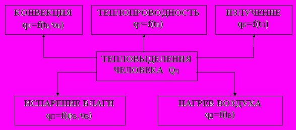Тепловое взаимодействие человека со средой осуществляется в процессе сложного тепломассообмена, т.е., во-первых, за счет составляющих теплообмена: