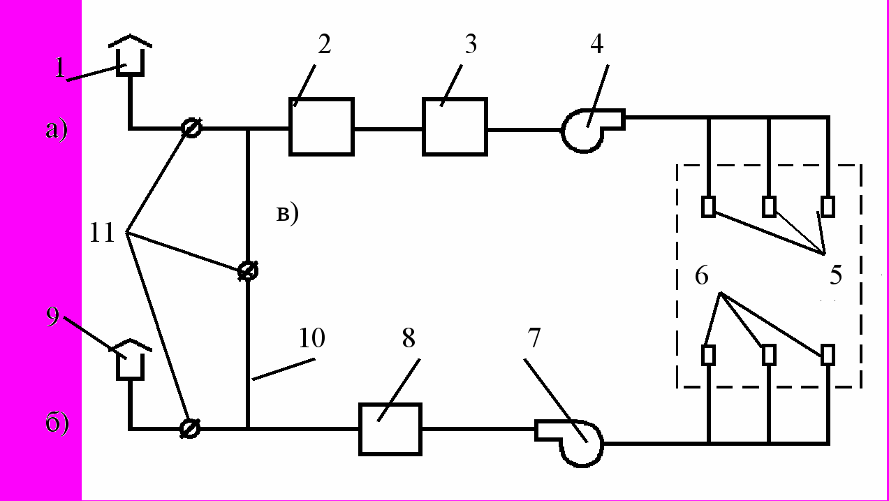 Рециркуляция используется в помещениях без выделения ВВ или при выделении ВВ 4 класса опасности, если их концентрация в подаваемом воздухе не превышает 0,3 ПДК. К таким в основном относятся помещения ВЦ, компьютерные классы и т.п. Во всех остальных случаях используется или приточная (поз. 1-5), или вытяжная (поз. 6-9), или приточно-вытяжная вентиляция (без рециркуляции).