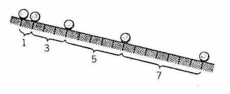 Оказалось, что расстояния, пройденные шариком за последовательные одинаковые промежутки времени (за первую, вторую, третью и т. д. секунды), соотносятся как 1:3:5:7:9 и т. д. То есть, расстояние, пройденное шариком за вторую секунду, в три раза, а за третью – в пять раз больше, чем за первую.