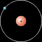 В центре шарик с единичным положительным зарядом, протон, а вокруг по орбите вращается отрицательно заряженный шарик, электрон. Масса протона в 1840 раз больше массы электрона, это и без Резерфорда было известно, поэтому протон в какой-то степени можно считать неподвижным.