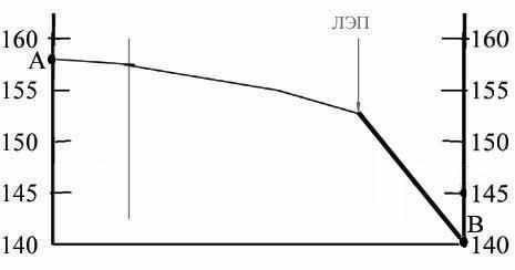 18. На рисунках представлены варианты профиля рельефа местности, построенные на основе карты по линии А – В разными учащимися. Профили отличаются на участке от линии электропередач до точки В. Какой из профилей построен верно?