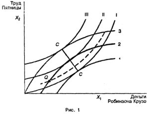 "Кривые безразличия" 1, 2, 3 - это кривые Пятницы, обладающегох1, но не имеющегох2, линии I, II, III - это кривые Робинзона Крузо, обладающего х1, но не имеющего х2. Эджуорт привел некоторые доводы, чтобы показать, что эти кривые выпуклы относительно их собственных осей. Геометрическое место точек пересечения двух множеств кривых безразличия образует то, что Эджуорт назвал "контрактной кривой" СС. Окончательное соглашение между участниками торговли должно иметь место на СС, ибо любая другая точка такова, что одна из сторон может улучшить свое положение, не ухудшая положение другой, смещаясь к контрактной кривой. Таким образом, от точки Q Робинзон Крузо может передвинуться к кривой безразличия более высокого уровня II, тогда как Пятница остается на той же кривой безразличия 2. Однако любая из точек кривой СС - возможное состояние равновесия, и точное положение С зависит от торгов и стратегии. Проблема недетерминированности не возникает при конкурентном обмене, так как все участники в этом случае сталкиваются с одним и теми же заданными ценами на все блага.