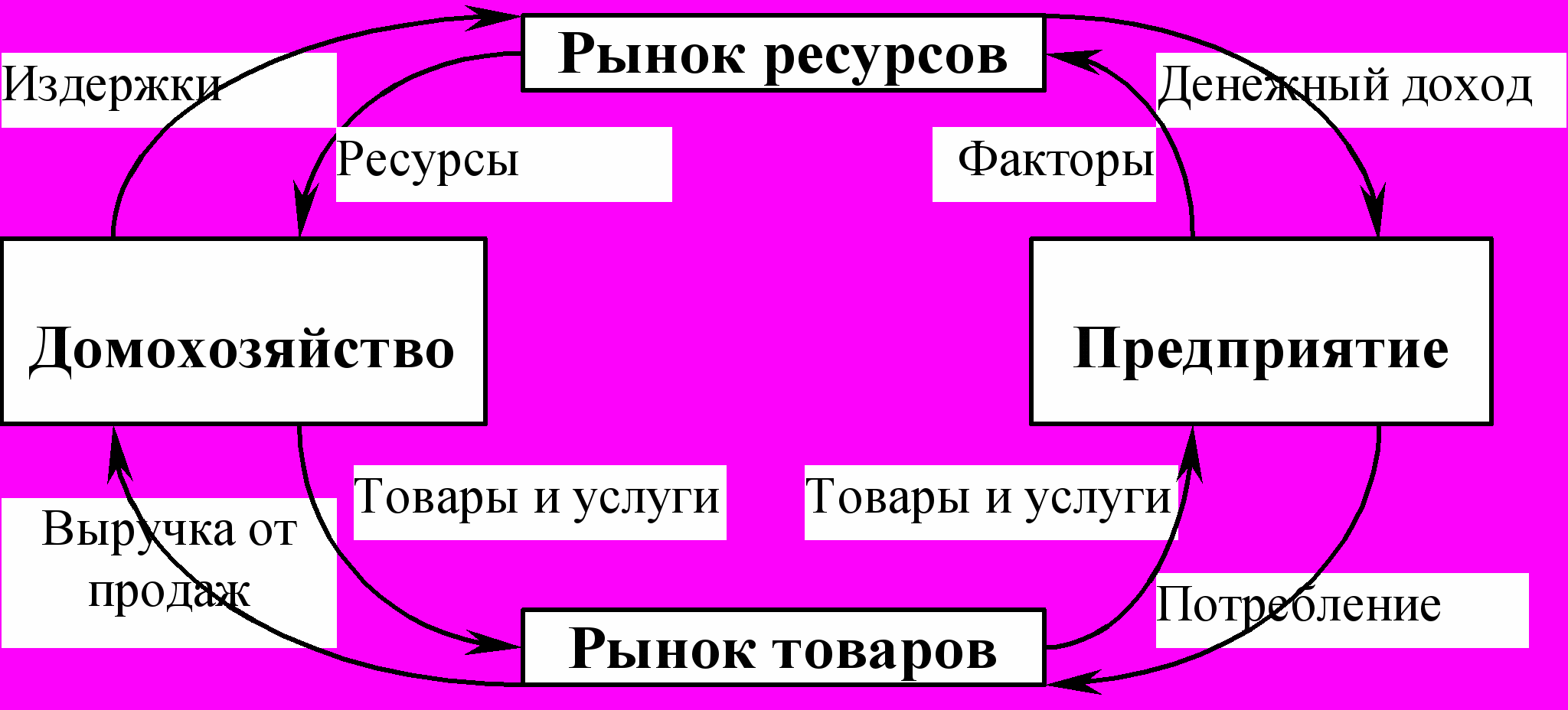 Предприятия, покупая ресурсы у населения, действует как покупатель, а реализуя готовый товар, как продавец. Таким образом, домохозяйства и предприятия связаны двумя рынками: ресурсов и товаров. Навстречу потоку факторов производства, товаров и услуг, движущемуся на схеме против часовой стрелки, движутся деньги (доходы от факторов производства, потребительские расходы, предпринимательские доходы и затраты на ресурсы).