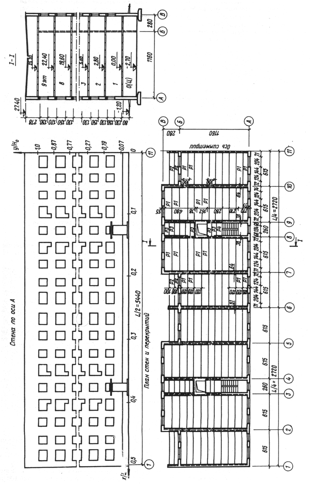 Здание девятиэтажное, кирпичное, с поперечными несущими стенами, с опиранием на них плит перекрытий (I типа) длиной 108,8 м, шириной 14,4 м, высотой 28,6 м, высота этажа - 2,8 м (черт.10).