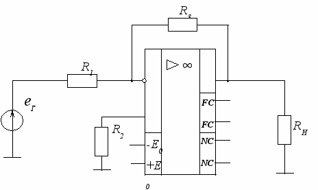 ) - усилитель с бесконечно большим коэффициентом усиления. Инвертирующий вход обозначен кружком. В дополнительных полях помещены следующие метки: +E0, -E0 - подключение источников питания, FC- подключение цепей коррекции АЧХ; NC - подключение элементов балансировки усилителя. Цепи коррекции и балансировки индивидуальны для каждого усилителя и поэтому на рисунке 6 не показаны.С