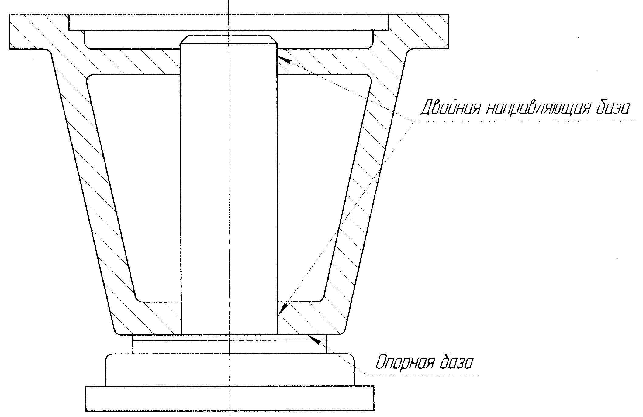 Двойная направляющая база - база, лишающая заготовку или изделие четырех степеней свободы - перемещений вдоль двух координатных осей и поворотов вокруг этих осей.