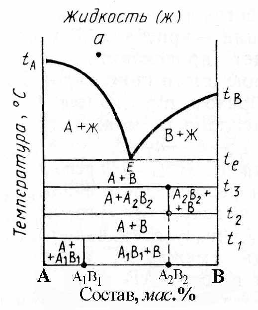 1. Диаграмма состояния двухкомпонентной системы с бинарным соединением, плавящимся инконгруентно (рис. 5). Что является признаком такого соединения на диаграмме? Опишите, что показывают элементы строения этой диаграммы: кривые ликвидуса, точки эвтектики и перитектики. Характер процессов, происходящих при эвтектической и перитектической температурах. Опишите последовательность фазовых превращений при охлаждении расплавов составов а1, а2 и а13 и нагревании соединения АВ.