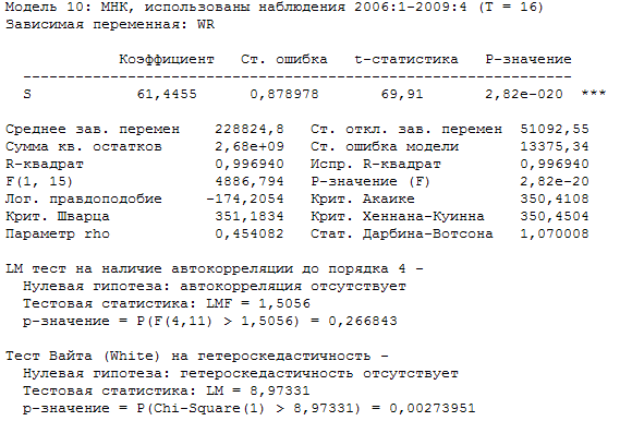 Проведенные тесты на гетероскедастичность и автокорреляцию дали отрицательные результаты. В модели отсутствует гетероскедастичность и автокорреляция. Так же тест на нормальность распределения остатков дал положительный результат. Проведенный тест на мультиколинеарность, подтвердил её отсутствие в модели. Все коэффициенты регрессии в полученной нами модели являются статистически значимыми. Величины информационных критериев Акаике и Шварца в модели (2.10) лучше соответствующих величин критериев в модели (2.8). Исходя из этого полученную модель (2.10) можем признать наиболее удачной.