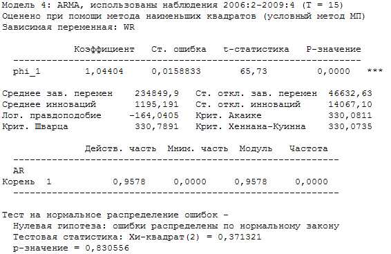 Построим модель данного временного ряда, использую средства Gretl. В для моделирования модели воспользуемся моделью временного ряда ARIMA(q, ∆, p). Где q-параметр авторегрессии; ∆- величина разностей уровней ряда, p – параметр скользящего среднего. В результате подбора параметров модели, проверки их значимости, лучшей оказалась модель ARIMA(1, 0, 0) без константы.