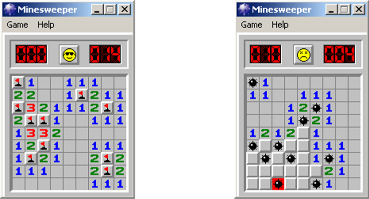 В начале игры поле закрыто. Игрок начинает проверять произвольные клетки, открывая их содержимое. Если он думает, что под данной клеткой – мина, он может не открывать ее, а маркировать флажком. Если игрок откроет пустую клетку (вокруг которой ни одной мины), то программа автоматически открывает все пустые клетки, смежные с данной, а также (не все!) не занятые минами клетки, смежные с пустыми.