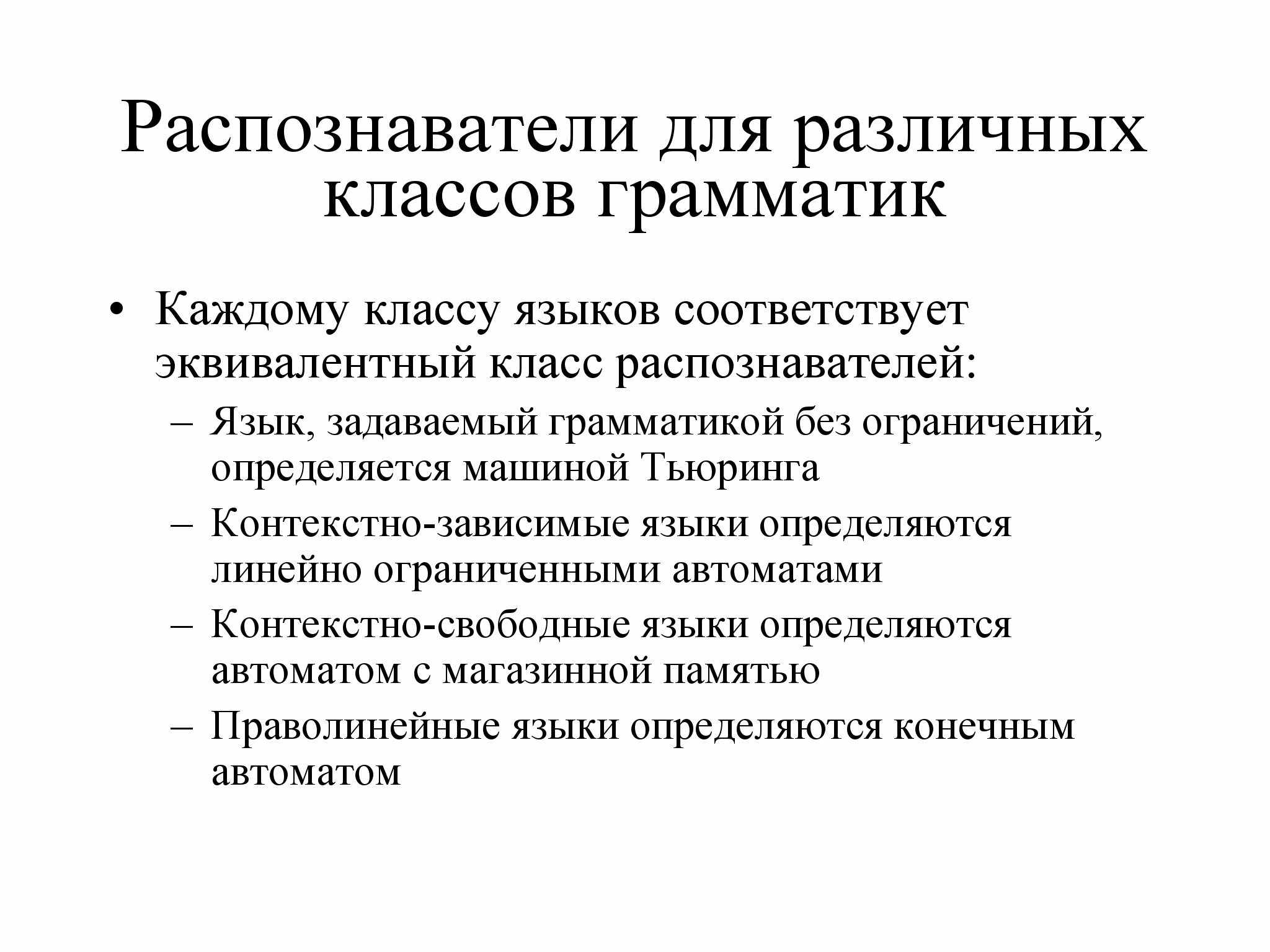 Оказывается, каждому классу грамматик из иерархии Хомского соответствует класс распознавателей, определяющий тот же класс языков: