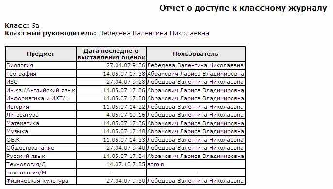 Указывается, какой учитель, когда и во сколько последний раз выставлял оценки в классный журнал.