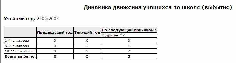 Отчёт составляется за учебный год и содержит данные о количестве выбывших учащихся по параллелям в текущем году в сравнении с предыдущим годом (если таковой имеется в системе). В отчёте указываются причины выбытия. Данная информация позволяет проводить анализ выбытия из школы и причин выбытия.