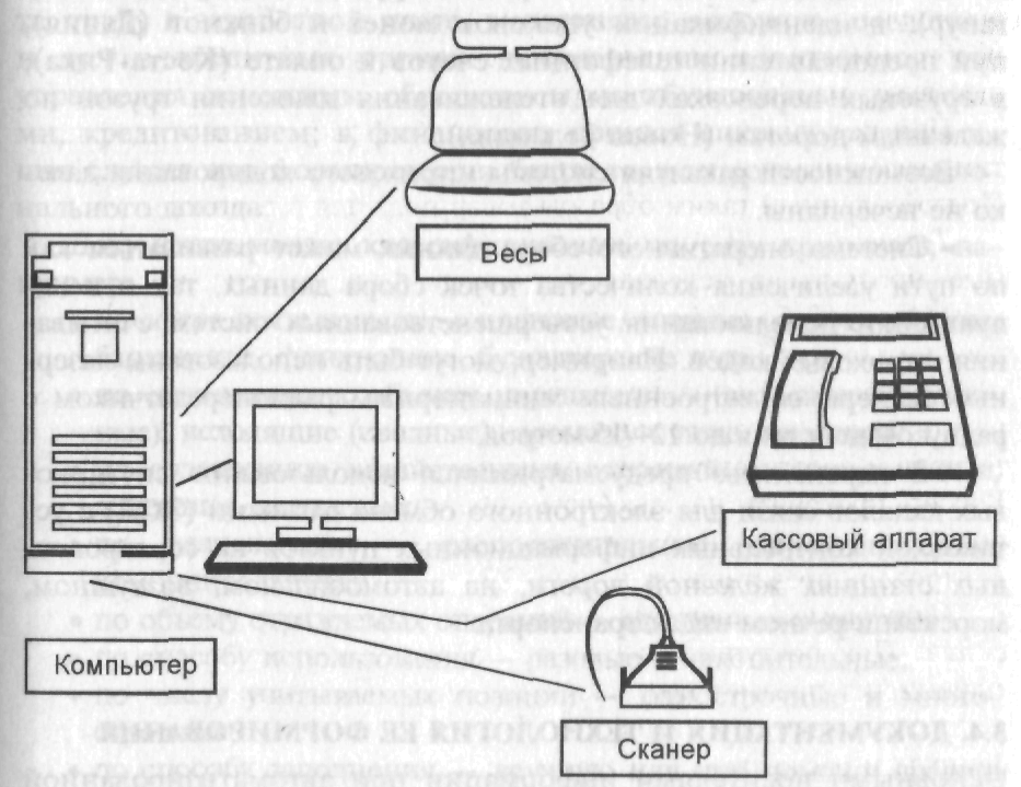 Торговый зал. В торговом заде покупатель набирает необходимые продукты в тележки и подходит для оплаты к кассиру-контролеру. Рабочее место кассира-контролера оснащено сканером для считывания штриховых кодов, соединенным с кассовым аппаратом. Кассовый аппарат, в свою очередь, соединен с компьютером, в память которого занесены штриховые коды всех имеющихся товаров и соответствующие им цены, устанавливаемые магазином. Кассир проверяет на кассовом аппарате стоимость покупки, используя сканирующее устройство. Рабочее место кассира-контролера представлено на рис. 3.6.