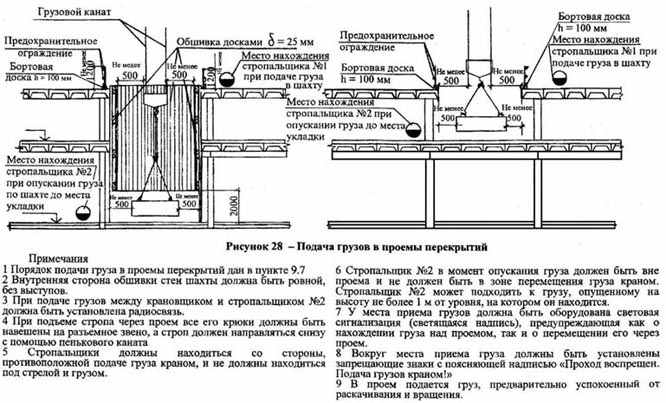 Указания. Подачу грузов в проемы (люки) перекрытий и покрытий следует производить по специально разработанному проекту. При подаче груза в проемы (люки) перекрытий и покрытий необходимо опускать груз и поднимать крюк со стропами на минимальной скорости без их раскачивания.
