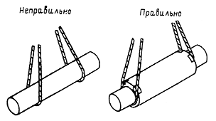 6. При строповке конструкций с острыми ребрами методом обвязки необходимо между ребрами элементов и канатом установить прокладки, предохраняющие канат от перетирания. Прокладки должны быть прикреплены к грузу или в качестве инвентарных постоянно закреплены на стропе.