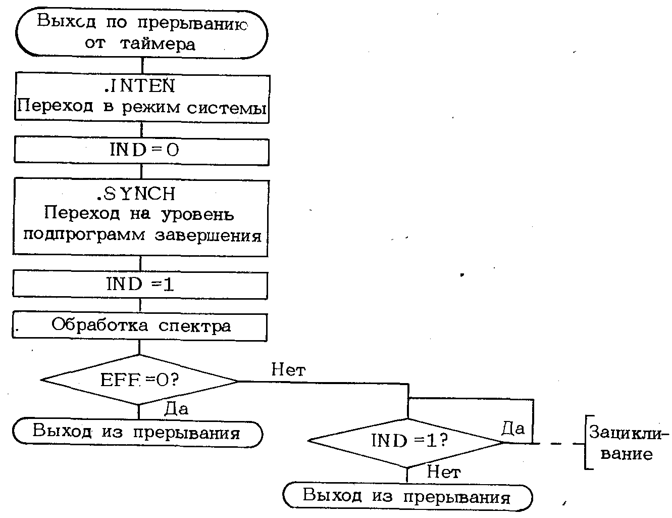 Индикатор IND (рис. 9.9) служит для завершения «предыдущей», продленной программы TIMINT после того, как в результате прерывания от таймера эта программа активизируется повторно. Пока эффект отсутствует и запись спектров на ГМД не производится, EFF = О и программа TIMINT после анализа значения EFF завершается выходом из прерывания. Если же в процессе обработки происходит запись спектра на ГМД и EFF <> 0, то программа TIMINT после анализа значения EFF зацикливается в ожидании сброса индикатора IND (IND устанавливается, как только программа TIMINT переходит с уровня прерываний на уровень подпрограмм завершения). Очередное прерывание от таймера повторно активизирует программу TIMINT, при этом выполнение «предыдущей» программы TIMINT приостанавливается на одной из команд цикла проверки значения индикатора IND. «Новая» программа TIMINT начинает работать на максимальном уровне приоритета процессора, затем с помощью программного запроса .INTEN переходит на уровень прерываний в режим системы.