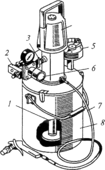 1- поршневой насос; 2 - пневмопривод; 3- трехходовый кран; 4 -двигатель; 5 — ротационный двигатель; 6 — клапан; 7 — шланг; 8 — сосуд для материала.