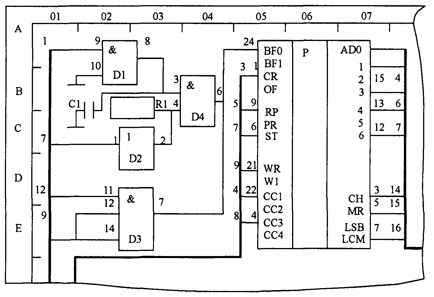 УГО цифровых элементов строится на основе прямоугольника и может содержать основное и два дополнительных поля (рис. 3.4.3 – элемент Р). Размер прямоугольного поля по ширине зависит от наличия дополнительных полей и числа помещенных в них знаков (меток, обозначения функций элемента), по высоте — от числа выводов, интервалов между ними и числа строк информации в основном и дополнительных полях. Ширина основного поля должна быть не менее 10 мм, дополнительных — не менее 5 мм, расстояние между выводами - 5 мм.