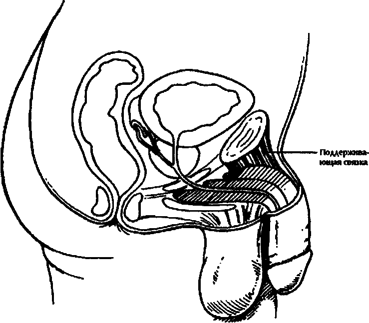 Рис. 39. Поддерживающая связка, соединяющая основание пениса с лобковой костью.