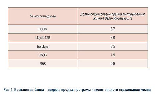 Концепция bancassurance заключается в интеграции банков и страховых компаний с целью координации продаж, совмещения страховых и банковских продуктов, каналов их распространения или выхода на одну и ту же клиентскую базу, а также доступа к внутренним финансовым ресурсам партнёра. В разных странах банковское страхование устроено различным образом в зависимости от демографического, экономического и юридического климата и традиций. Нет общего для всех стран опыта организации банковского страхования. При этом следует отметить, что распространение страховых полисов через банки приобрело весьма существенную роль в общем объёме продаж страховых компаний, особенно в страховании жизни, где такая доля в европейских странах занимает до 70 процентов. Для примера приведу долю отдельных английских банков в общем объёме премии по страхованию жизни в стране (рис.4). В азиатском регионе доля банковских продаж в общем объёме страховой премии выглядит скромнее. Однако за последние 10 лет эта доля существенно выросла. На рис. 5 мы можем посмотреть таблицу, дающую представление о развитии банковского страхования в Азии.