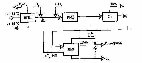 Принципиальная схема установки низкотемпературной изомеризации C5 - C6 алканов с катализаторм на основе платиносодержащего хлорированного