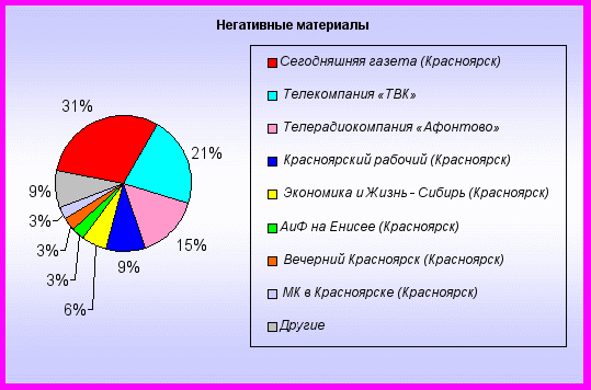Таким образом, в пул изданий, чаще всего поставляющих в медиа-поле дискредитирующую деятельность «Русского алюминия» информацию вошли, прежде всего, «Сегодняшняя газета», «Красноярский рабочий», «АиФ на Енисее», «Экономика и жизнь - Сибирь», а также телекомпании «ТВК» и «Афонтово».